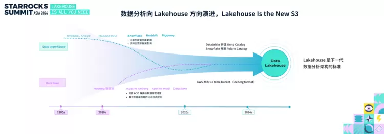 2024 年,Lakehouse 的发展更是迎来了重要的里程碑:Databricks 收购 Tabular,并开源 Unity Catalog;Snowflake 开源 Polaris,争相抢占 Lakehouse 的入口。另外,就在三天前的 AWS reinvent 大会上,AWS 发布了 S3 Tablet Bucket,采用了 Iceberg 的开放格式。种种迹象表明,Lakehouse 的时代已经到来。