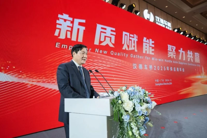 12月16日,汉德车桥2025年供应商年会在广州隆重举行。本次年会以“新质赋能、聚力共赢”为主题,旨在与广大供应商伙伴共同探讨当前快速变化的市场环境中,如何通过引入新质力量为双方乃至整个供应链生态赋能,从而增强竞争力,实现聚力共赢的新局面。陕重汽总经理支保京、汉德车桥党委书记、总经理王占朝出席会议,会议由汉德车桥副总经理王林主持。