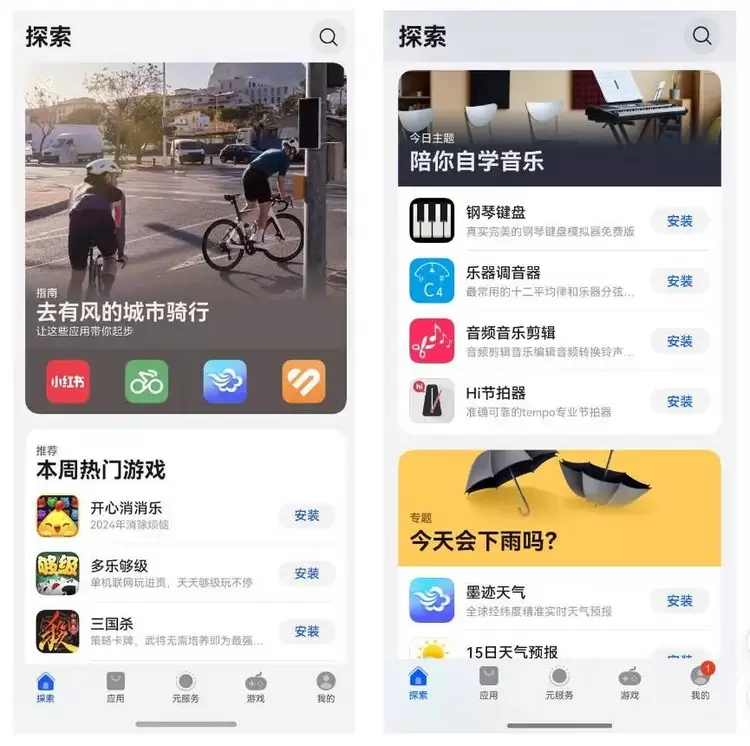 比方说,「旅行」应用似乎是一个成熟标准化的红海市场,遵循一贯思路,难以设计出有突破点的产品。但 AppGallery 就尝试将「城市骑行」作为切入点,通过一份善用小红书、骑行导航、墨迹天气、运动健康等一系列应用的骑行指南,我们能充分感受到其背后不急不躁、不疾不徐的生活主张。