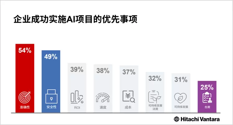 •制定AI战略时缺少投资回报率(ROI)分析,或没有考虑可持续发展。仅有31%的企业将可持续发展列为部署AI的优先事项。相较而言,有更多一点的企业(39%)会优先关注投资回报率。