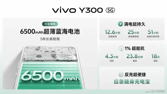 除了强大的音频体验,vivo Y300在续航方面同样表现出色。其搭载的6500mAh超薄蓝海电池,不仅打破了蓝海电池容量的纪录,更以5年的耐用性为用户提供了持久安心的续航体验。vivo首创的“魔方扩容封装”技术,以及自研玲珑架构的采用,使得Y300在容纳如此大容量电池的同时,仍然保持了7.79mm的纤薄机身,内部集成度再创Y系列新高。