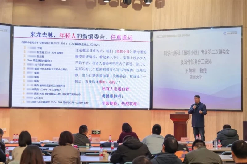此外,王旭初教授还组织了《植物小肽》专著第二次编委会。王教授回顾了《植物小肽》专著的初步构想和目标,强调了专著在系统总结植物小肽研究进展、推动学术交流和知识传播中的重要作用。并详细介绍了编委会的分工和任务布置,进一步推进了专著写作出版计划。编委们表示,他们将共同努力,确保专著能够准确反映植物小肽研究的最新进展,为推动植物小肽研究领域的发展做出贡献。