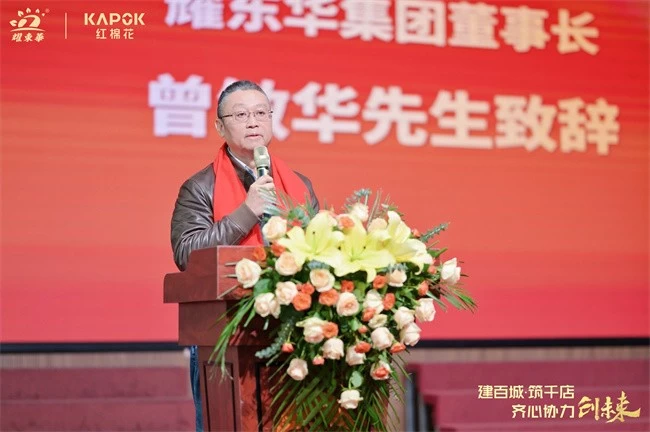 耀东华集团副总经理闫利红女士以《建百城,筑千店,齐心协力创未来》为主题展开了精彩的开场报告。首先,她对 2024 年集团的营销数据进行了简单总结。闫利红女士重点提出了红棉花标准化展厅的重要性。标准化展厅不仅是产品展示的空间,更是品牌形象的直观体现。它能够为消费者提供统一、高品质的购物体验,增强品牌的辨识度和美誉度。通过标准化的设计和布局,能够更好地展示产品的特点和优势,激发消费者的购买欲望。最后,闫利红女士对 2025年的目标和品牌赋能政策做了简要陈述。