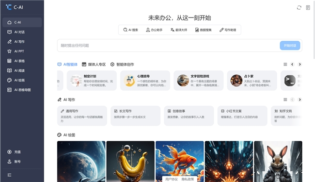 进入后的平台页面是下图这样,而且已经贴心为你划分好了创作模块,AI对话、写作、PPT、表格、阅读、绘画、思维导图,基本上班族常用的工作项目都包含在内。