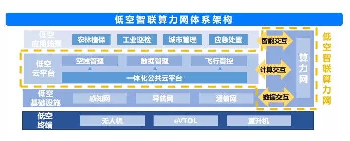 在此背景下,需要大力发展低空智联算力网,驱动低空产业迈入智能时代。低空智联算力网是低空应用场景面向算力应用与调度需求进行能力增强和系统升级形成的新型基础设施和技术产业体系,以云、边、端协同的低空算力网为核心,以低空云平台为载体,为无人机等低空飞行器以及其他低空经济活动提供算力支撑、数据存储/处理和分析、智能化等服务。