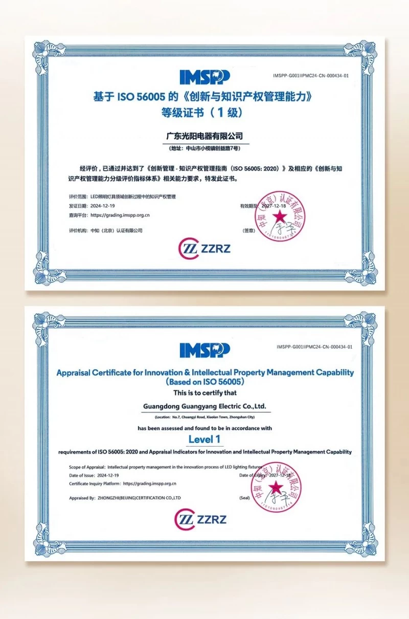 近日,广东光阳电器有限公司(冠雅)凭借其卓越的创新实力与知识产权管理能力,成功获得中知(北京)认证有限公司颁发的基于ISO56005标准的《创新与知识产权管理能力分级评价》,成为了中山照明领域内首家获得此级别认证的企业。这一成就不仅彰显了冠雅在行业内的领先地位,也体现了其深厚的品牌底蕴和对创新的不懈追求。