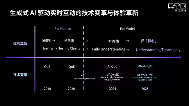 同时,Gen AI 也在驱动 RTE 实时互动的技术变革与体验革新,在人与人的实时互动中,声网一直致力于实现从 QoS 服务质量到 QoE 体验质量的技术变革,在体验层面也从“听得到“变为“听得清”。而在人与 AI 的实时互动中,为了进一步增强体验,RTE 的技术变革也演变为 AI QoE 甚至多模态 AI QoE,这背后就包含了声网自研的 AI VAD 能力、降噪能力及网络优化等一系列技术能力,以使得人与 AI 的对话更符合实际情况,大模型也从理解内容,变成理解对话人的心理、情绪,最终理解对话时的人类意图,最后实现从“听得懂“到“听「得心」”的体验革新。