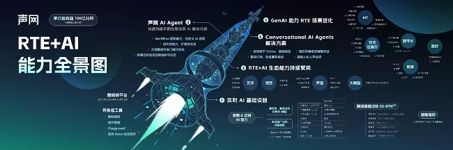最后刘斌还介绍了声网 RTE + AI 能力全景图,包括 RTE+AI 生态能力、声网 AI Agent、Conversational AI Agents 解决方案等,全面的展现了声网对 RTE+AI 的整体思考,致力于成为 GenAI 时代 AI 基础设施的关键部分。