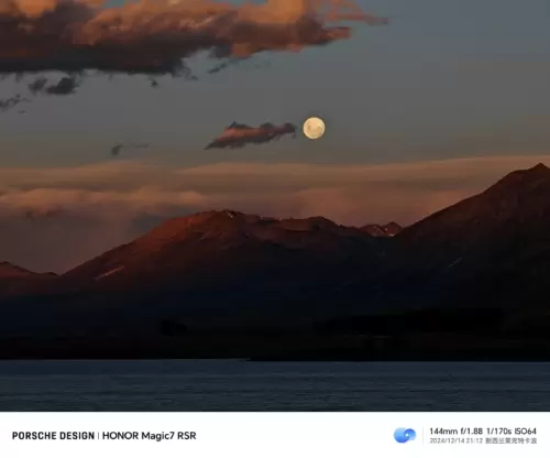 从微博中了解到,样张拍摄于晚上9点。从整个样张画面来看,环境正处于夕阳西下光线极弱、月亮已经升起的蓝调时刻,荣耀Magic7 RSR 保时捷设计的镜头在低照度环境下展现出超强的感光能力。f/1.88超大光圈,进光量明显提升,结合荣耀强大的AI大模型算法,释放传感器极限解析力,让夜景更纯净,云朵的色彩层次丰富,山体的纹理清晰。整幅画面如同亲眼所见,让人仿佛身临其境。