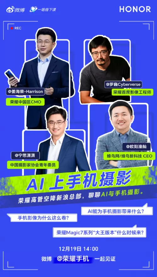 为了更深入地探讨AI与手机摄影的关系,以及手机影像的未来发展趋势,荣耀中国区CMO姜海荣、荣耀首席影像工程师罗巍、中国摄影家协会青年委员宁思潇潇、蜂鸟网CEO欧阳潼舢做客新浪总部进行了一场精彩的对话。他们共同探讨了手机影像为何如此“内卷”、AI能为手机摄影带来哪些变革,以及荣耀Magic7系列“大王版本”的亮点所在。