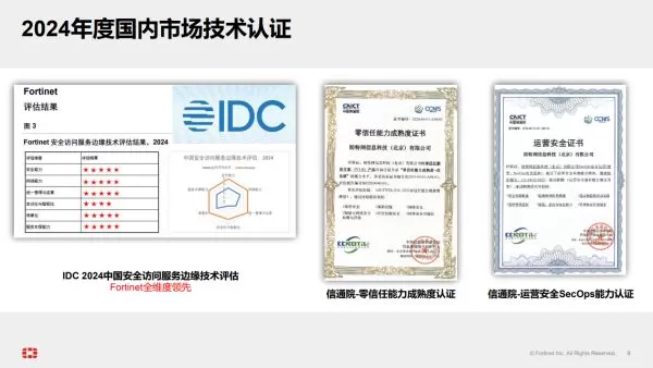 2024年度,Fortinet中国区在业务拓展上也取得显著成就,不仅助力C2G/G2C业务蓬勃发展,销售业绩持续增长,更在SecOps产品上实现了40%+的销售额占比增长,统一SASE产品增长20%+,OT方案增长45%+,SD-WAN方案增长12%+。此外,Fortinet荣获IDC中国安全访问服务边缘技术评估全维度领先,以及信通院零信任与运营安全SecOps能力认证。