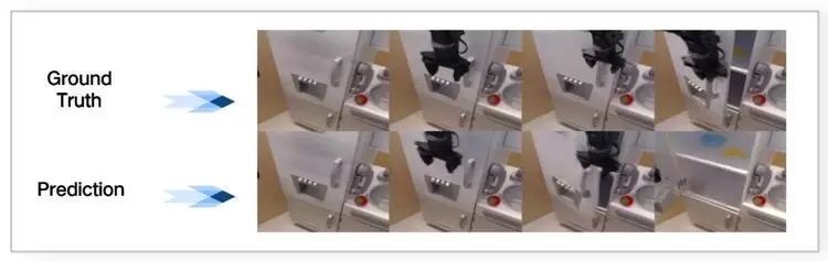 例如,下图中上方的图片展示了真实物理世界中打开冰箱的逐帧操作,下方的图片则为ERA-42生成的环境建模与对打开冰箱任务的逐帧预测。可以看到两张图片非常接近,说明模型预测非常准确。这与其他机器人大模型直接学习行动、而忽视对世界本身理解的方式,或者仅将世界模型用于生成仿真数据的方式,存在本质的区别。