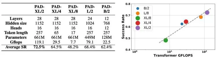 并且研究结果表明,随着模型规模的扩大,任务成功率也明显提升,初步体现了和大语言模型训练中类似的“Scaling效应”,即模型规模与性能之间的正相关性。