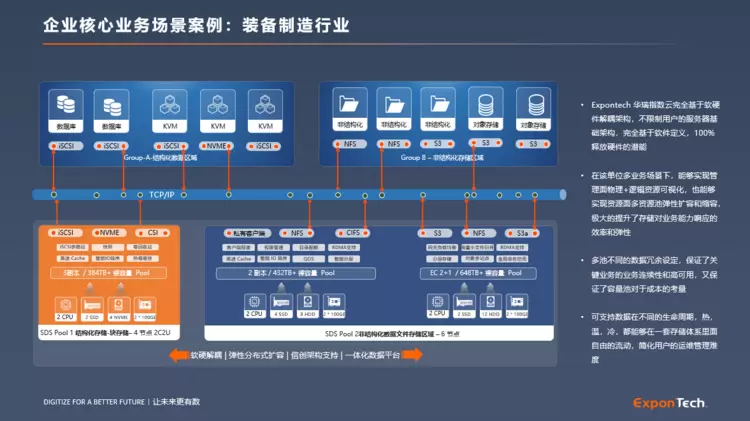 吴波还分享了华瑞指数云ExponTech在航空航天、装备制造、金融、芯片制造、互联网和能源电力等行业的核心业务场景案例,展示了SDS2.0在实际应用中的卓越表现和客户收益。其中 ,华瑞指数云ExponTech面向航空航天领域的统一数据平台,更采用分布式软件架构,对传统存储阵列和大数据存储系统进行现代化升级,通过大数据统一数据平台,真正实现装备试验数据全生命周期管,为装备发展各阶段应用场景提供智能化数字化的存储解决方案。
