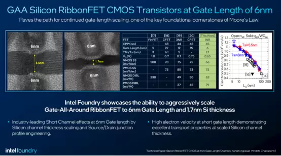 Intel展示了其在Gate-All-Around(GAA)RibbonFET晶体管上的技术突破,成功将栅极长度缩小至6nm,并实现1.7nm硅通道厚度。通过对硅通道厚度和源漏结的精准工程设计,有效减少了漏电流和器件退化,提高了晶体管在极短栅极长度下的性能稳定性。英特尔研究数据显示,与其他先进节点技术相比,在6nm栅极长度下,RibbonFET在短栅极长度下具备更高的电子迁移率和更优的能效特性。除此之外,RibbonFET实现了最佳的亚阈值摆幅(Subthreshold Swing,SS)和漏电流抑制性能(DIBL)。