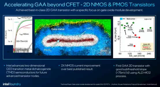 据Sanjay Natarajan的介绍,具体而言,英特尔在GAA技术中引入了二维(2D)NMOS和PMOS晶体管,该晶体管以二维MoS2为沟道材料,结合高介电常数的HfO2作为栅氧化层,通过ALD(原子层沉积)工艺实现精确控制。下图的横截面成像清晰展示了栅极金属、HfO₂氧化物和二维MoS2之间的结构集成,其整体厚度在纳米级别,漏源间距(L_SD)小于50nm,次阈值摆幅(SS)低于75mV/d,最大电流性能(I_max)达到900µA/µm以上,能够显著提升栅极对沟道的控制能力。