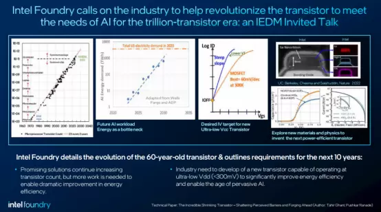 英特尔也呼吁整个行业共同推动晶体管技术的革命,以满足万亿晶体管时代中AI应用的需求。通过对过去60年晶体管发展的总结,Intel同时提出了未来10年的发展目标:1)必须开发能够在超低供电电压(<300mV)下工作的晶体管,以显著提高能效,为普遍化的AI应用提供支持;2)持续增加晶体管数量的技术是可行的,但能源效率的革命性突破将是未来发展的重点。