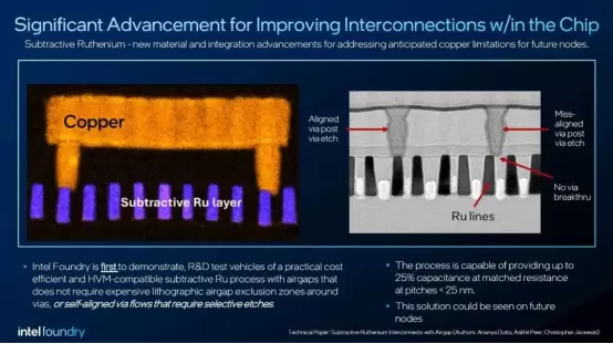 这种新工艺在小于25nm的间距下,实现了在匹配电阻条件下高达25%的电容降低,有效提升了信号传输速度并减少了功耗。高分辨率的显微成像展示了钌互连线和通孔的精确对齐,验证了没有发生通孔突破或严重错位的问题。减法钌工艺支持大规模生产(HVM),通过消除复杂的气隙排除区和选择性蚀刻需求,具备实际应用的经济性和可靠性。