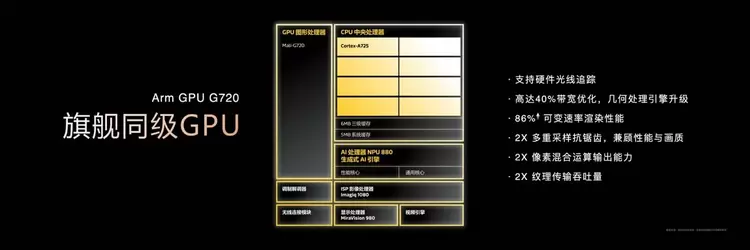 天玑 8400的强大不仅仅体现在CPU上,GPU表现同样堪称“神级进化”。它搭载了旗舰同级7核Mali-G720 GPU,带宽优化高达40%,并针对多重采样抗锯齿、像素混合运算输出和纹理传输吞吐量等关键技术进行了深度优化,图形计算能力实现了全面突破。此外,天玑 8400可变速率渲染性能提升高达86%,还支持硬件光线追踪技术。这些技术升级,将给玩家带来沉浸感拉满的游戏体验。