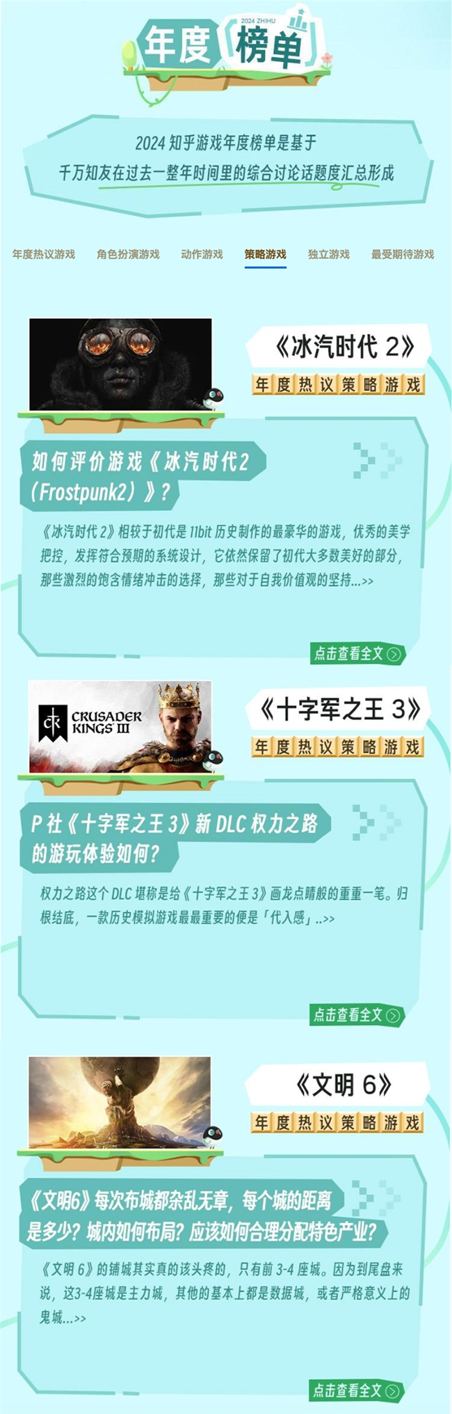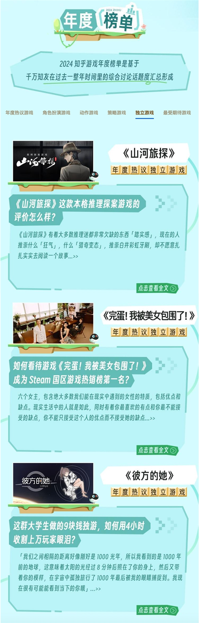 知乎聚集了大量对游戏有深度理解和热情的玩家、评论家和行业专家,此番年度游戏榜单的推出,不仅是对过去一年游戏界的一次集中回顾,也是对游戏文化、社区互动、市场趋势的综合反映。此外,无论是“一款匠心游戏的诞生”还是“游戏年鉴”线上圆桌的陆续开启,知乎都以专业多元讨论场给予游戏IP口碑建设、游戏内容生命力以有效延伸,推动游戏文化的健康发展。