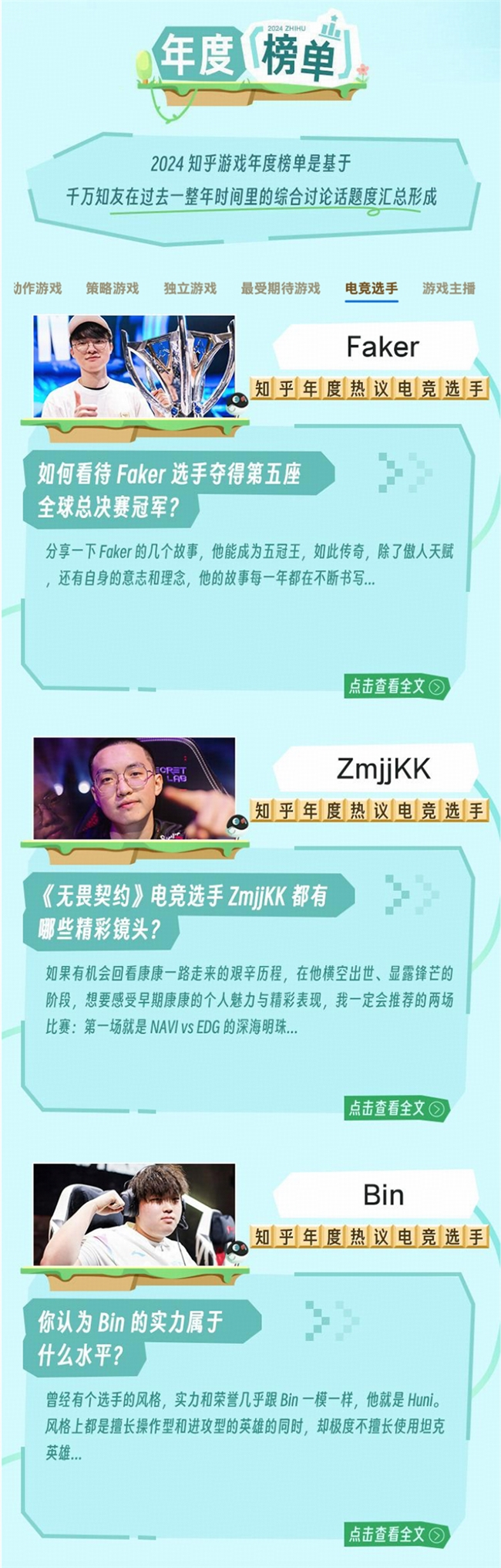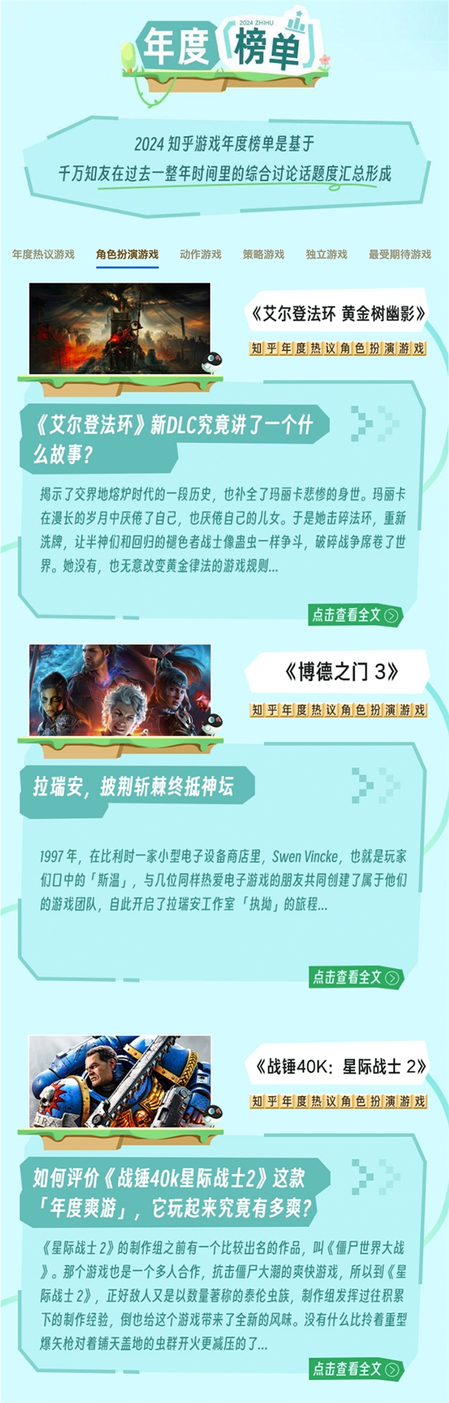 “2024知乎游戏年度榜单”还有其他诸多奖项,《艾尔登法环 黄金树幽影》、《博德之门3》和《战锤40K:星际战士2》入选了“角色扮演游戏”,“年度策略游戏”由《冰汽时代2》、《十字军之王3》和《文明6》摘得,“年度独立游戏”分别为《山河旅探》《完蛋!我被美女包围了!》和《彼方的她》。Faker、ZmijjKK和Bin成为了知乎”年度电竞选手“,”年度游戏主播“则由Uzi、余小C和洞主摘得。