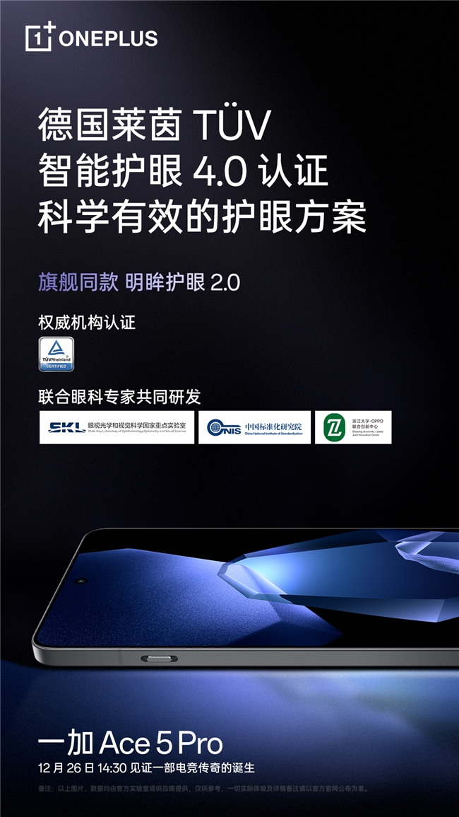 在护眼体验方面 ,一加 Ace 5 系列搭载的第二代1.5K东方屏搭载一加 13 同款「明眸护眼 2.0」技术,支持行业唯一的「真·全亮度类DC」与「明眸低频闪 2.0」,实现显示、护眼和流畅性三者的完美结合,即使在高强度游戏场景下也能保持护眼效果。此外,一加 Ace 5 系列还全面升级了全亮度自然光显示、舒适色温 2.0、节律健康2.0、硬件级低蓝光和 AI 护眼等多项护眼黑科技,确保用户即使在夜间玩游戏也能保护视力,长时间使用也不会感到疲劳。凭借一系列全方位的护眼技术,一加 Ace 5 系列搭载的第二代 1.5K 东方屏获得了「德国莱茵 TÜV 智能护眼 4.0 认证」。