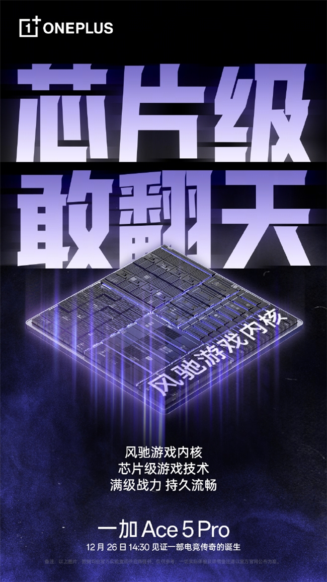 即将发布的一加 Ace 5 系列至高搭载骁龙 8 至尊版旗舰移动平台,匹配至高16GB LPDDR5T高规格闪存和1TB UFS 4.0 超大内存,顶级性能配置全面拉满。同时, 一加 Ace 5 系列全系搭载自研芯片级游戏技术「风驰游戏内核」,带来行业最优的游戏单帧功耗,游戏场景功耗、发热明显降低,并且突破帧率和画质限制,带来某大型开放世界手游120 帧 + 1080P 画质满血同开,有着堪比芯片迭代的超强游戏表现,是当之无愧的游戏体验天花板。一加 Ace 5 系列还搭载至高 6400mAh 的超大容量冰川电池、最高 100W 超级闪充,轻松实现最快35分钟就充满电的极速充电体验。一加 Ace 5 Pro 还拥有行业领先的「旁路供电」技术,大幅减少边玩边充机身发热。