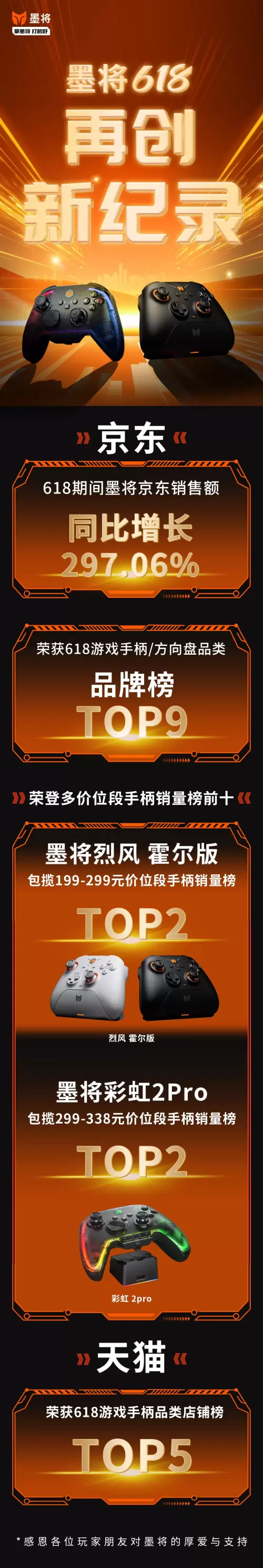 根据京东618大促期间的销售数据显示,墨将实现了近300%的销售额同比增长,其中旗舰产品“彩虹2 Pro”在299元价位段取得了第2名的好成绩,同时入门级手柄“烈风双霍尔版”在游戏手柄品类中也荣登第2名。这一成绩不仅凸显了墨将在不同价位段的市场竞争力,也证明了品牌在满足不同玩家需求方面的能力。对于墨将而言,这一成绩代表着一次布局新手柄的好机会。
