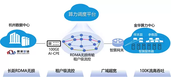 首先,以跨地市AI大模型训练能力创新重构智算训练模式。传统的智算集中训练模式,需要用户将样本上传到智算中心进行落盘训练,但是部分用户对隐私样本落盘存在安全顾虑。浙江联通通过IP广域无损方案,实现了杭州存、金华训的“数据不落盘”拉远训练,以算网协同的能力,为企业用户隐私样本训练探索出了一条新路。