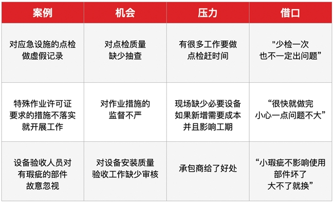 在探讨安全问题时,一个典型的 “机会-压力-借口” 组合表现为:员工在日常操作中采取捷径往往不易被察觉(机会);即便采取捷径导致事故,也存在一定的概率,因此不一定会立即发生问题(借口);然而,如果不采用捷径,工作效率可能会立即低于他人(压力)。
