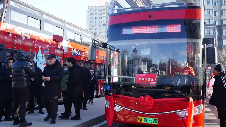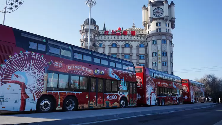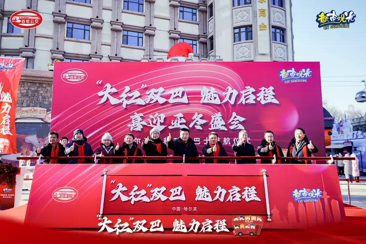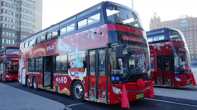 2024年12月24日,哈尔滨松花江索道广场迎来了一场别开生面的盛宴,“大红双巴 魅力启程”喜迎亚冬盛会——哈尔滨春秋观光巴士首航仪式正式启动。活动现场,安凯大红双巴盛装登场,惊艳亮相。车身精心绘制冰雪大世界、中央大街等哈尔滨文旅地标图案,宛如流动的画卷,熠熠生辉。“都市观光,city Sightseeing,hop on,hop off”的字样在阳光下闪耀,国际范尽显,冰城新徽立现。
