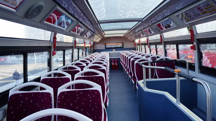 作为哈尔滨新时代公交+文旅融合的典型之作,安凯双层巴士集聚高颜值、高品质于一身。车辆时尚大气,挺拔饱满的“中国红”车身让人耳目一新,车身哈尔滨城市特色满满,吸睛亮眼。为满足最大观光效果,安凯双层巴士两侧配置大幅观景窗,整车通透明亮,二层更是采用贯穿式全景天窗,以360°全景式的观光视野,让游客沉浸式观赏沿途风景,感受“尔滨”独特城市魅力。同时车内还巧妙融入十六国语音系统,将车、景、人、服务解说融为一体,精准满足了国外游客的实际观光需求。