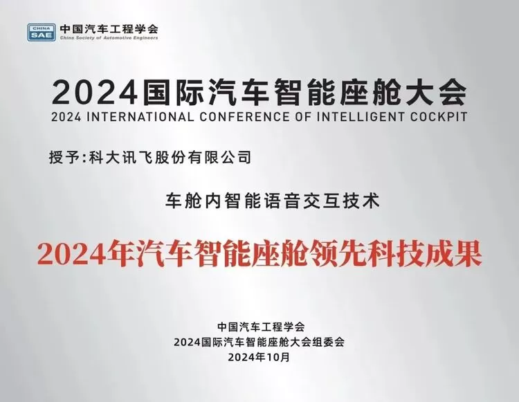 值得一提的是,此前,科大讯飞还凭借“车舱内智能语音交互技术”获得由中国汽车工程学会评选的“2024年汽车智能座舱领先科技成果”奖。