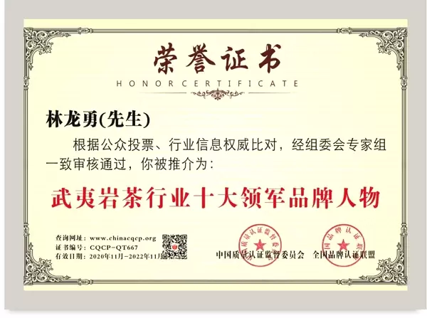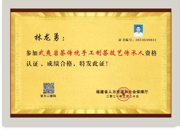 林龙勇,茶叶泰斗“张天福”徒孙,获“国茶人物.制茶大师”、“老字号工匠技艺传承人”、“武夷岩茶传统手工制茶技艺传承人”、“高级非遗制茶技艺传承师”、“武夷岩茶行业十大领军品牌人物”等荣誉称号。