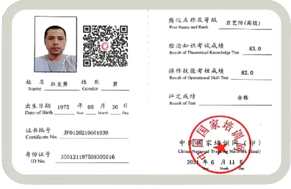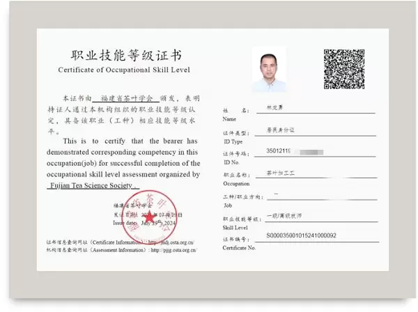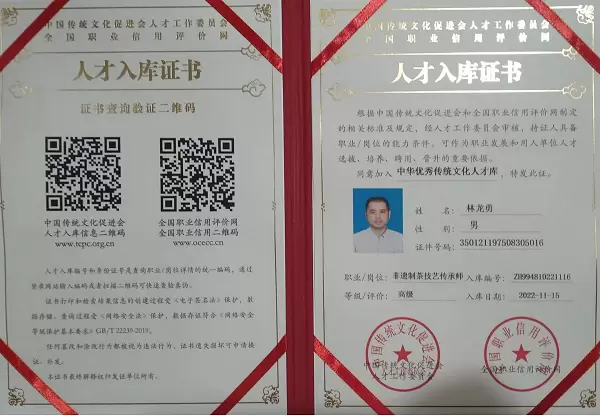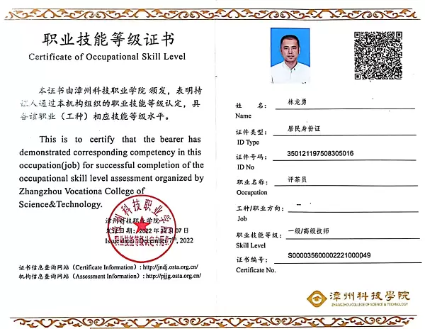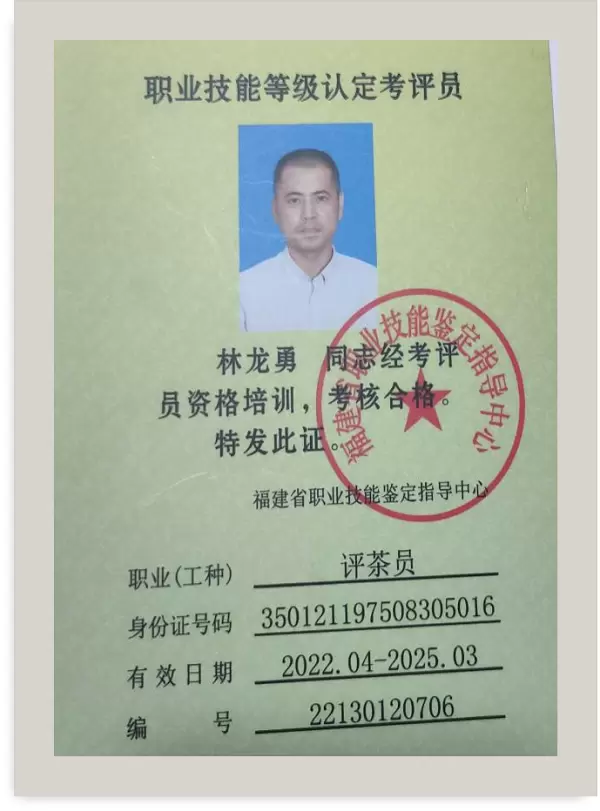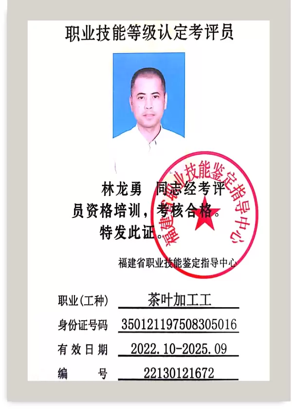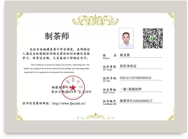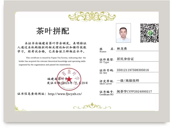 其毕业于福建农林大学茶学专业,制茶近30年,取得“国家高级农艺师”副高级职称,获得“国家一级/高级评茶技师”、“国家一级/高级茶叶拼配师”、“国家一级/高级茶叶加工技师”、“国家一级/高级制茶师”等多个国家级职业技能等级证书,经权威机构认定为“武夷岩茶茶评员考评员”、“武夷岩茶茶叶加工工考评员”,入选《中华优秀传统文化人才库》,是中国目前极少数科班出身还参与制茶实践与理论创新的专家。
