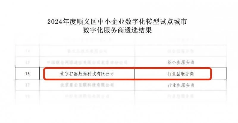 谷器数据入选北京市顺义区中小企业数字化转型试点城市数字化服务商