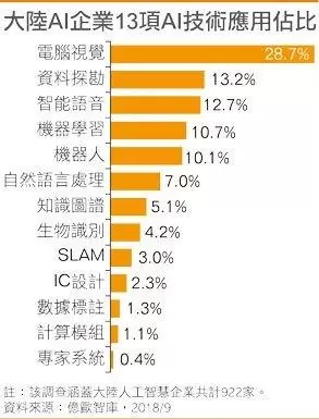 上述922家企业,分布于中国22个省份的43个城市,其中北京、 上海、广东占74.2%。在13项人工智能技术方向上, 技术应用占比前5大分别为电脑视觉、数据探勘、智慧语音技术、机器学习和机器人。