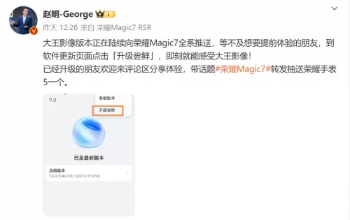 荣耀CEO赵明通过微博分享了“大王影像”升级的消息,并鼓励用户前往软件更新页面体验新功能。用户仅需通过软件更新页面点击‘升级尝鲜’,即刻感受影像技术的全新高度。升级推送后,大批用户争相尝鲜。