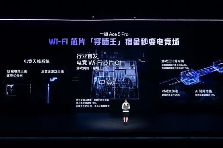 一加 Ace 5 Pro 首发搭载行业首个专门为手机游戏网络定制的芯片——电竞 Wi-Fi 芯片 G1。在连接同个路由器的情况下,一加 Ace 5 Pro 网速对比没有 Wi-Fi 芯片的同平台机型高 50%,彻底告别游戏中的网络延迟和卡顿。同时,电竞 Wi-Fi 芯片 G1 还拥有超远的信号连接能力和穿透能力。在信号穿墙场景下,网络时延相比无 Wi-Fi 芯片的同平台机型降低 30.2%。即使穿透 3 堵墙、超过 200 米,一加 Ace 5 Pro 也始终保持稳定通信,堪称 Wi-Fi 信号「穿墙王」。此外,一加 Ace 5 Pro 还采用 13 根电竞天线环绕式分布的天线设计,支持「对战流加速」、「AI 弱网增强」以及「游戏云计算专网」技术,即使在学生宿舍或弱网情况下,一加 Ace 5 系列也能保持赛场级流畅。