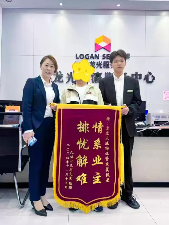 2024 年 12 月 5 日,顺德天瀛 9 栋业主周先生特意定制了一面写有 “情系业主、排忧解难” 的锦旗,赠予顺德天瀛客服管家莫振星,以此向龙光地产项目工作人员表达诚挚的感谢。