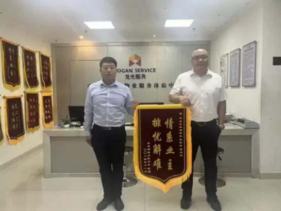 服务中心了解到阮先生为寻爱犬满心焦虑与无助的情况后,主动询问相关讯息,一边安抚业主一边帮助业主寻找狗狗。在各部门协同配合下,成功将狗狗送回业主身边。爱犬寻回的过程让阮先生感受了服务中心热心服务、严谨细致、急业主所急的服务态度,阮先生送来锦旗一面以感谢龙光地产项目工作人员热心相助。