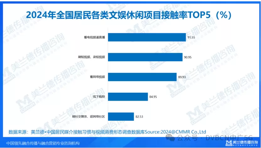 2024年全国居民各类文娱休闲项目接触率中,看电视频道直播排第一,达91.55%,其次的刷短视频、录短视频为90.95%。2024年全国居民每日文娱消费时长分布数据中,看电视频道直播达110.8分钟。