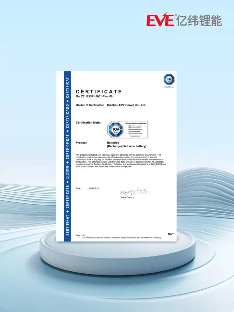 12月18日,惠州亿纬锂能股份有限公司(以下简称“亿纬锂能”)正式获颁TÜV南德意志集团(以下简称“TÜV 南德”)全球首张动力电池领域的欧盟新电池法规 (EU) 2023/1542 TÜV SÜD Mark证书。