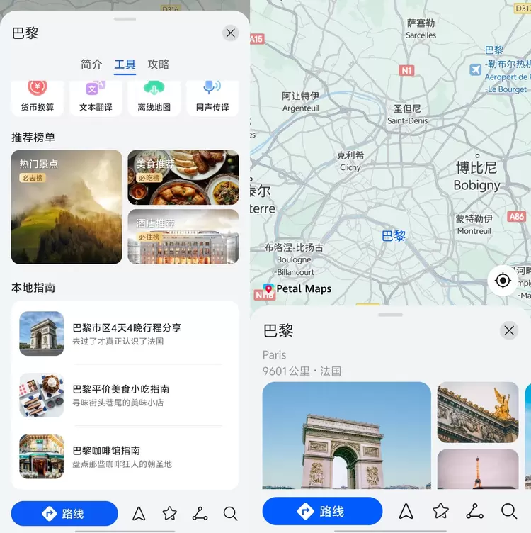 华为天际通提供的全球流量随心用服务,无需买卡换卡,不用提前购买流量,支持先用后付,按实际使用天数结算,开通后每次境外落地自动连接当地网络,一次开通,次次便捷。天际通还支持一人购买多人共享,可以把流量分享给同行的亲友,同时支持随时查看网络质量和流量使用情况,既方便又安心。而华为的花瓣地图则是一款全球地图导航软件,可以在国内提前下载,收藏好想要去的地方和想吃的美食,到达目的地后就可以更从容。它除了拥有精准的导航,还提供酒店预订、周边推荐等本地服务。如果想要去浪漫的巴黎打卡埃菲尔铁塔,走累了就可以打开花瓣地图搜索附近的美食,还会推荐当地评分高、有特色的法国菜餐厅,让味蕾得到极大满足。