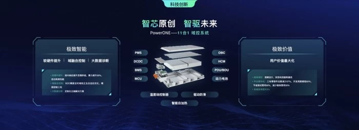 其中PowerONE是一款高集成度的动力集成域控系统,融合PMS、BMS、MCU、DCDC、OBC等十一合一总成,具有极致智能、极致价值的特点,它集成了远程7月发布的智芯自研动力电池——玄武电池,该电池采用 150mm 薄壳体,支持 AI CLOUD 云端自适应实时动态节能,拥有 10 年 80 万公里全生命周期质保,还有液冷快充系统、单体超 6000cls 循环,能大大提升用户运营效率。而同轴电驱桥采用共壳体及同轴设计,整合高效扁线电机、高效行星减速排关键部件,具有超高效率、超长寿命的优势。