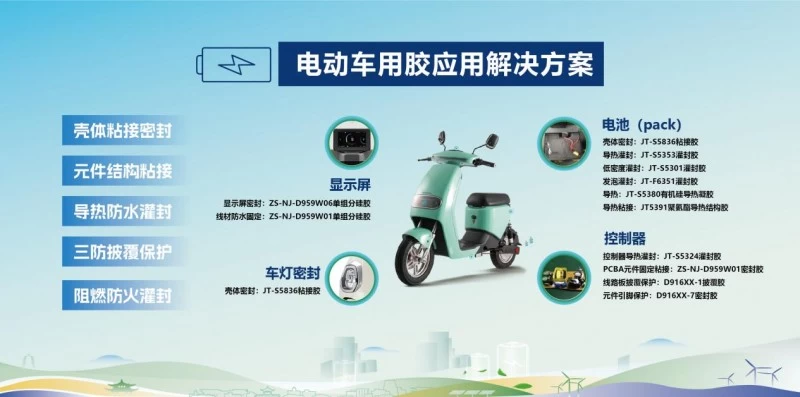 高新来在演讲中表示,集泰股份电动自行车用胶应用解决方案,可以为电池、显示屏、车灯、控制器等电动自行车部件进行密封,包括进行壳体粘接密封、元件结构粘接、导热放水灌封、三防披覆保护以及阻燃防火灌封等。