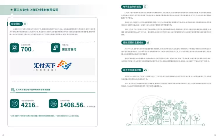 上海汇付支付有限公司是一家持牌第三方支付平台,业务涵盖互联网支付、移动支付、银行卡收单等多个领域。据统计,上海汇付支付有限公司一年签署的电子合同份数约为4216万份。依据法大大联合企业绿色发展研究院、北京绿色交易所开发的全国首个“签约减碳”模型计算,全年碳减排约为1408.56吨二氧化碳当量。