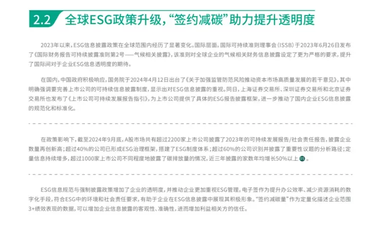 白皮书中的数据显示,到2024年9月底,A股共有2200家上市公司披露了2023年的可持续发展报告/社会责任报告,其中,超过40%的公司已形成ESG治理框架,搭建了ESG制度体系,超过60%的公司识别并披露了重要性议题的分析路径。