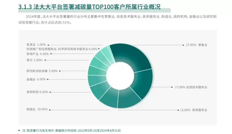 行业分布数据显示,法大大平台签署量的行业分布主要集中在零售业、信息技术服务业、商务服务业、制造业、政府机构、金融业以及研究和试验发展行业,合计占比达86.51%。这些领域,其实也是孵化培育新质生产力的重点领域。