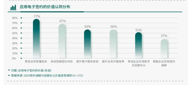白皮书中就提到这样一个调研数据:有77%的企业认为电子签约能降低签署成本;67%的企业认为能够有效规避风险;有56%的企业认为能够提升客户体验。